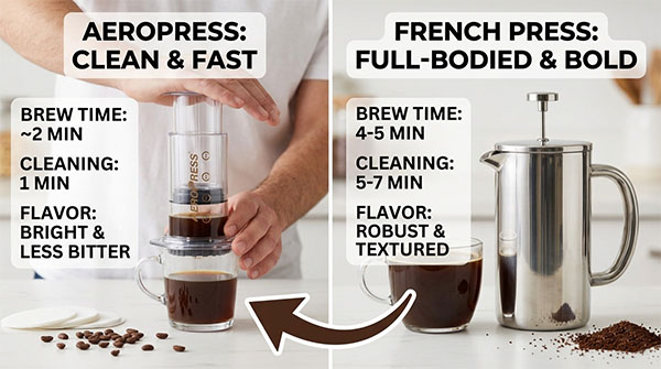 AeroPress vs French Press: faster brewing, significantly cleaner cup, and noticeably less bitterness.