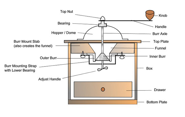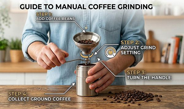 Manual grinders operate using two burrs that rotate against each other. When the handle is turned, beans move through the burrs and are crushed into evenly sized particles.